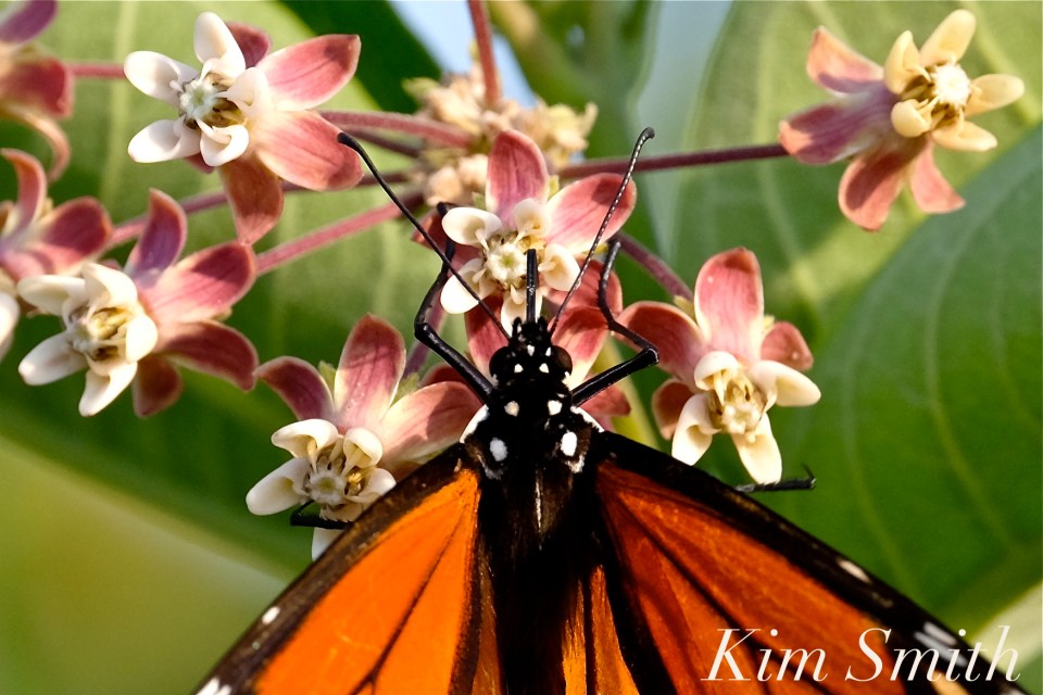 Monarchs not only drink nectar from the florets of milkweed, it is the only species of plant on which they deposit their eggs. In the above photo you can clearly see the Monarch probing for nectar with her proboscis, or drinking straw.