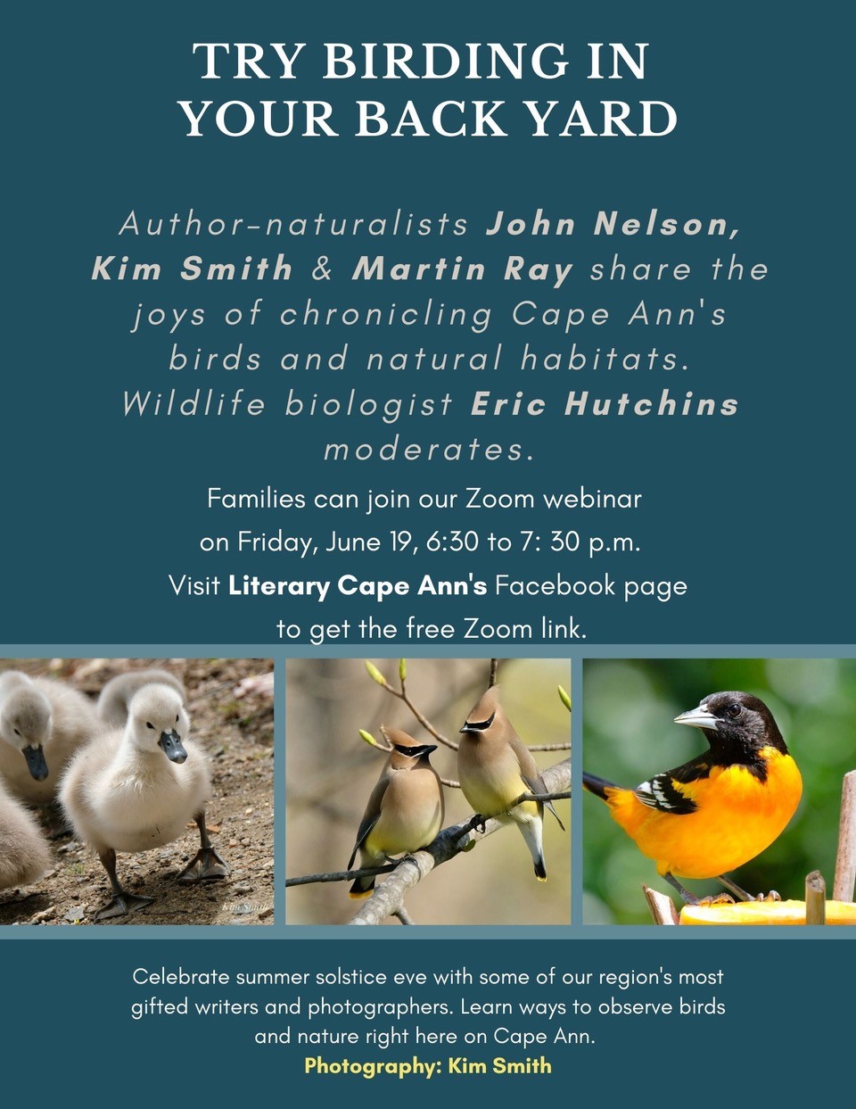 Three of our favorite chroniclers of birds and nature share birding tips and experiences via Zoom and all are invited. Literary Cape Ann presents authors/naturalists John Nelson, Kim Smith and Martin Ray on Friday, June 19, from 6:30 to 7:30 for a lively talk the family will enjoy. Learn ways not just to observe birds but to capture your experience with birds via blogs, journals, photos or sketches. Make some popcorn, gather your family and join us.