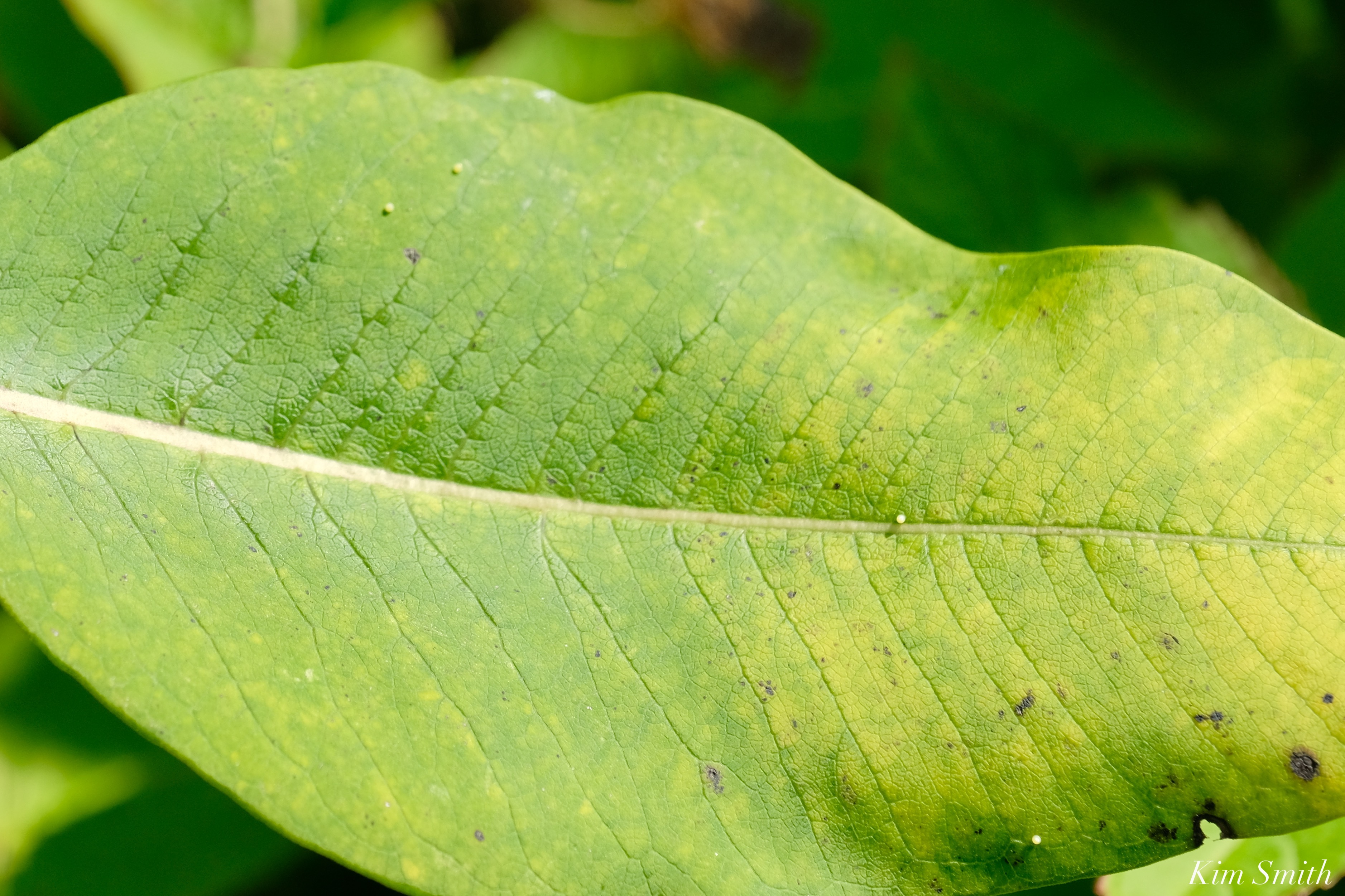 Female Monarch in the garden depositing eggs on September 13, 2021. Note the two tiny pin-head sized eggs on the milkweed leaf.